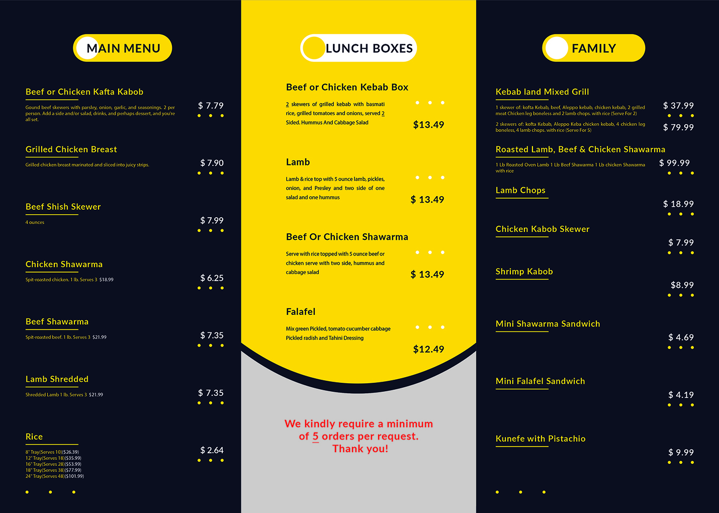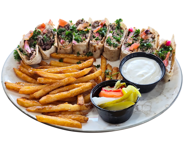 At Kebab Land, our chicken and beef shawarma are marinated to perfection using authentic Mediterranean spices and slow-roasted on a vertical grill for bold flavor in every bite. Whether you crave tender, juicy chicken or rich, seasoned beef, our shawarma wraps and plates are served hot, fresh, and loaded with taste. Pair it with our house-made garlic or tahini sauce for the perfect finish!.