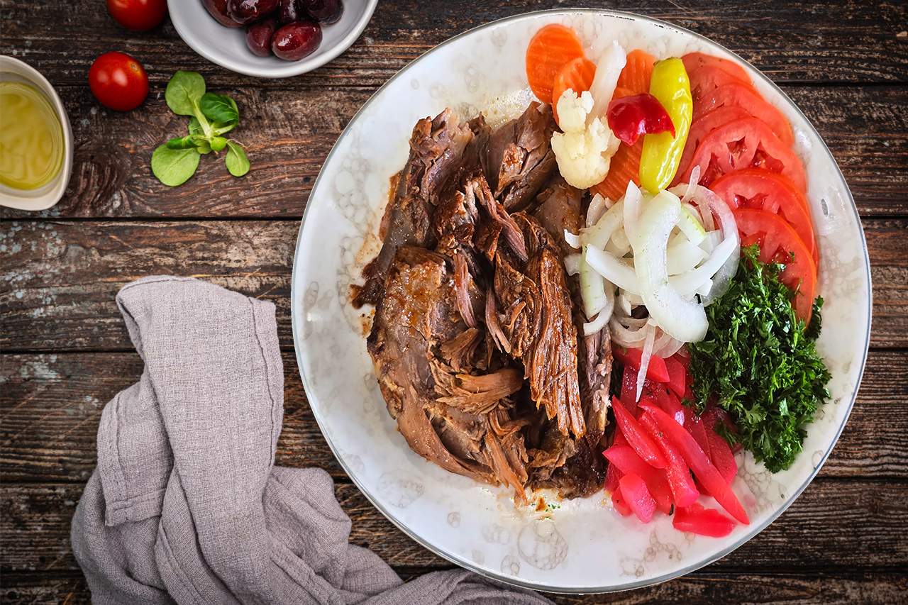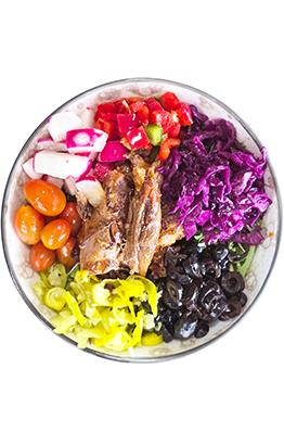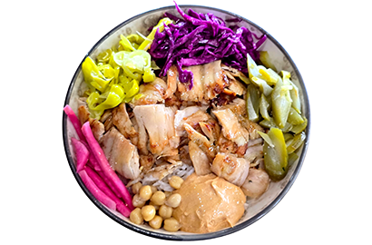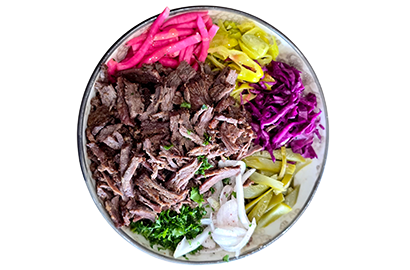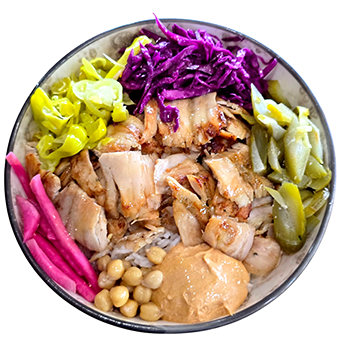 Our premium Shawarma Salad Bowl is packed with flavor and freshness. Enjoy a vibrant bed of crisp greens and veggies, topped with beef, chicken, and lamb shawarma slow-roasted in the oven for over 10 hours. This trio of tender, juicy meats delivers deep, authentic Mediterranean flavor in every bite. Finished with your choice of house-made garlic, tahini, or spicy sauce.