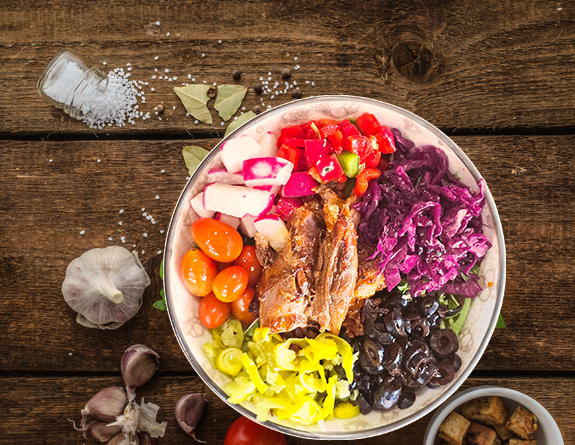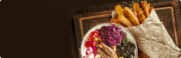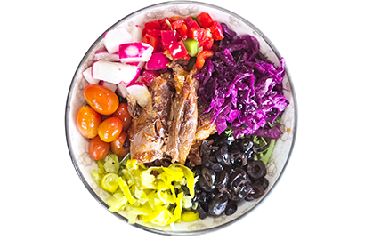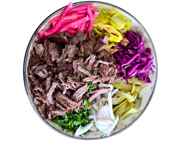 Our premium Shawarma Salad Bowl is packed with flavor and freshness. Enjoy a vibrant bed of crisp greens and veggies, topped with beef, chicken, and lamb shawarma slow-roasted in the oven for over 10 hours. This trio of tender, juicy meats delivers deep, authentic Mediterranean flavor in every bite. Finished with your choice of house-made garlic, tahini, or spicy sauce.